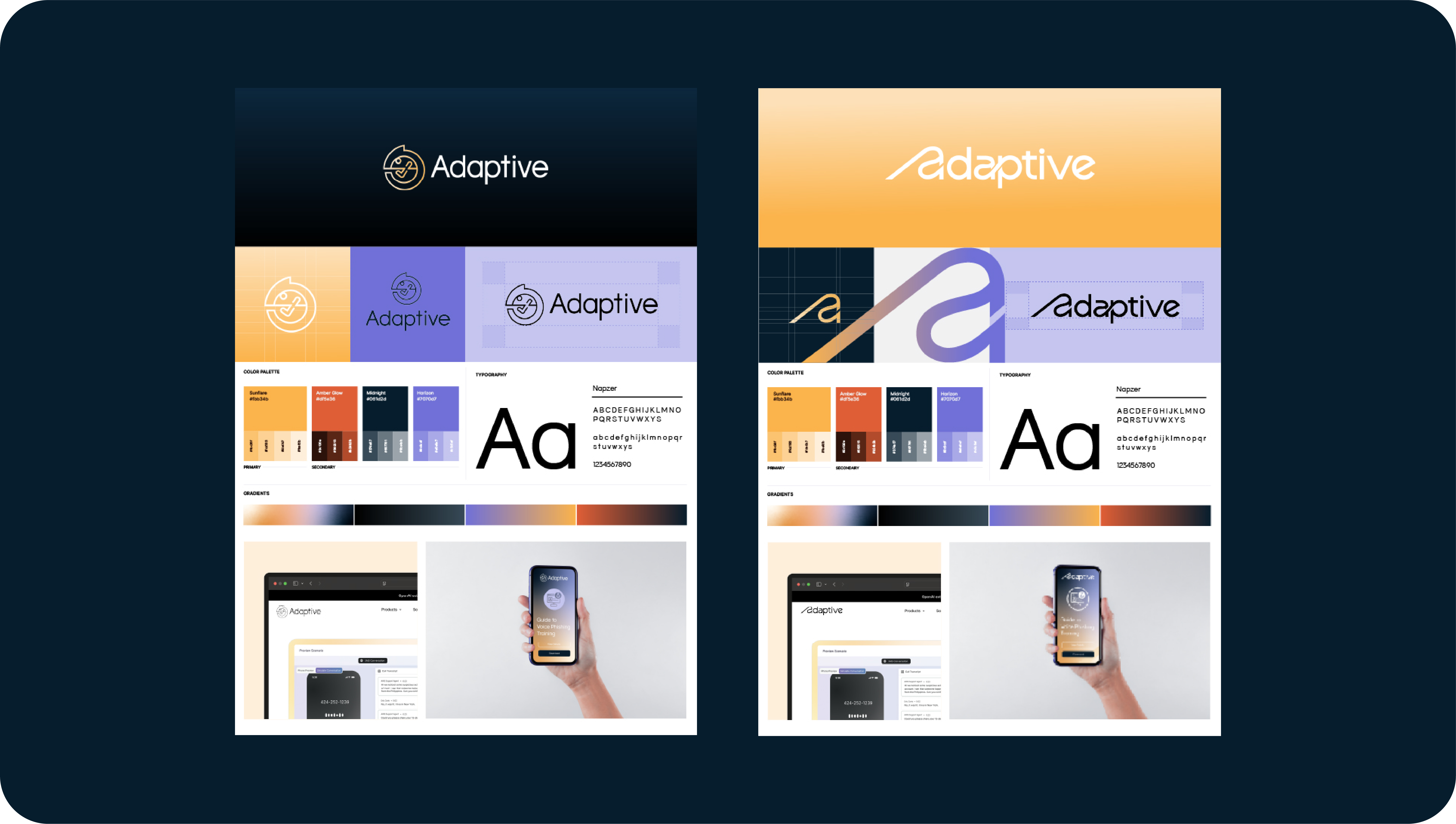 Develop two logo and icon concepts for Adaptive Security, creating a friendly, approachable identity with the warmth and personality of a consumer brand—distinct from typical SaaS aesthetics. The brief called for one abstract icon and one resembling an “A” shape, accompanied by a Sunrise color palette and typography exploration